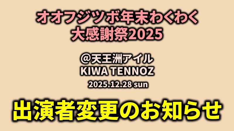 【重要】出演者変更のお知らせ: オオフジツボ年末わくわく大感謝祭2025 2025.10.31 毎年、大変多くの方にご予約・ご期待をいただいております「オオフジツボ年末わくわく大感謝祭」について、出演者変更に関する重要なお知らせがございます。 ↓以下の「オオフジツボ年末わくわく大感謝祭」ご案内ページをご参照ください。 オオフジツボ年末わくわく大感謝祭2025のご案内今年もやりますオオフジツボ年末わくわく大感謝祭!! ホーム「音や金時」は閉店してしまいましたが、場所を天王洲アイル「KIWA TENNOZ」に移して開催です。